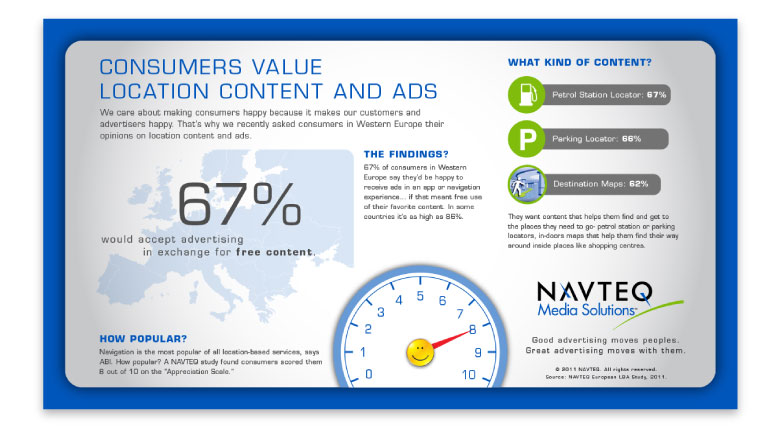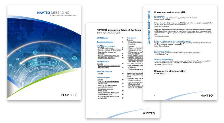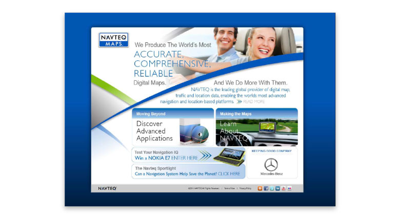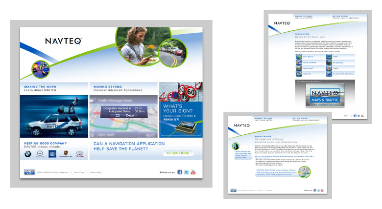NAVTEQ is the leading global provider of maps, traffic and location data (digital location content) enabling navigation, location-based services and mobile advertising around the world. NAVTEQ supplies comprehensive digital location content to power automotive navigation systems, portable and wireless devices, Internet-based mapping applications and government and business solutions. Cullinane provided many services including, positioning and messaging, integrated direct mail campaign creative (banner ads, html emails and landing pages), advertising, flash movies and simulations and infographics.