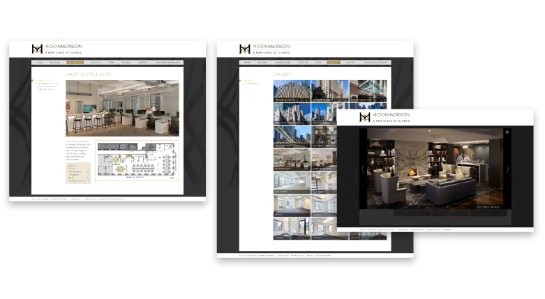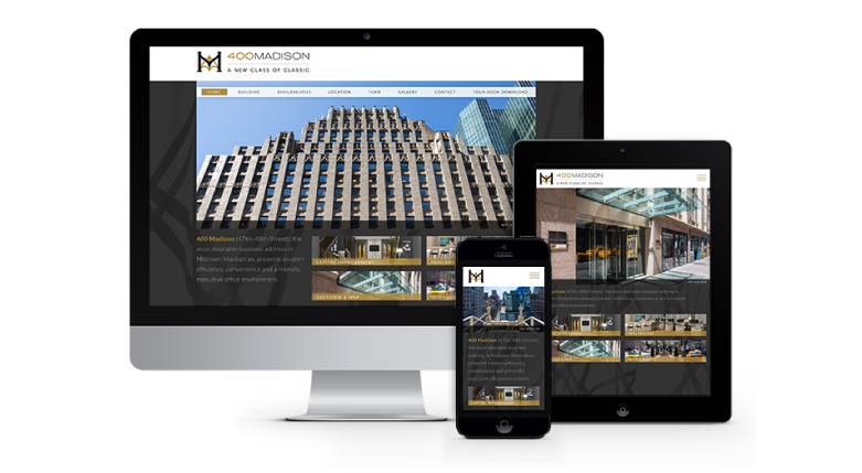 Located in New York City between 47th–48th Street, 400 Madison delivers the most desirable business address in Midtown Manhattan. Since the building represents modern efficiency, convenience and a boutique executive office environment, our web development team was tasked with developing a compelling website to support those tenets. We created an opening animation to support the combination of classic architecture with ultramodern amenities. Along with a cutting edge design, the Responsive Designed website development utilized the latest technologies and maximized the user experience by sensing the device upon which it was viewed and delivering the site to fit the medium. The result was a user experience that worked to it’s potential on the desktop, tablet and smart phone.