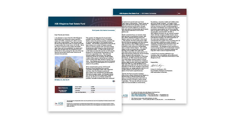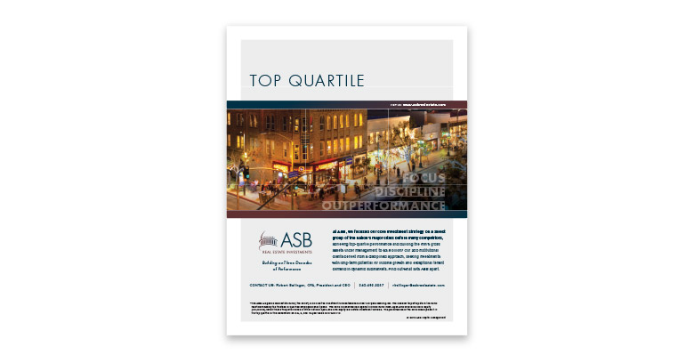 ASB Real Estate Investments (ASB), a division of ASB Capital Management, LLC, is a leading U.S. real estate investment management firm with more than $3.5 billion in gross assets under management for approximately 180 institutional clients. Headquartered in Washington, DC, ASB invests in major urban markets across the country, concentrating in office, multi-family, retail and industrial properties.