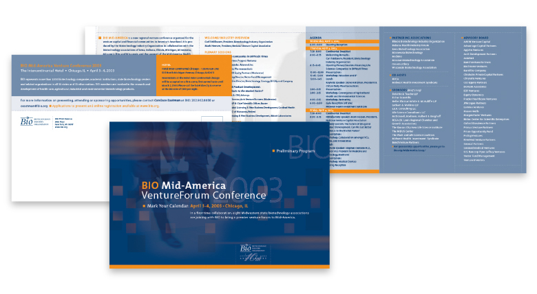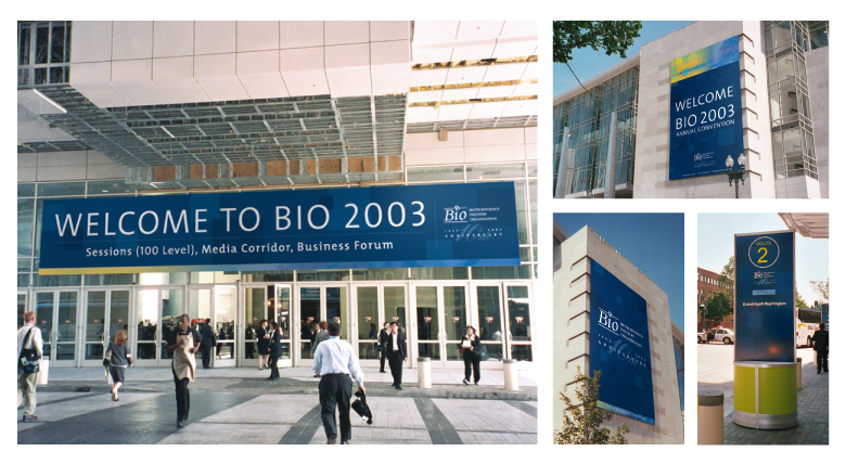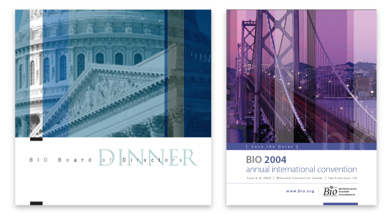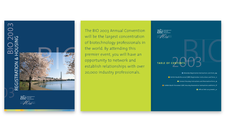 We first developed a visual concept theme based on a nautilus photo overlaid with biotech and digital imagery along with typographic and color standards which became the platform for all communications related to the event held that year in washington, DC. The applications of the brand included advertising, building and interior signage, press kits, 200 + page catalogue, invitations, direct mail, lanyards and brochures. All communications were rolled out over a one year period preceding the convention.