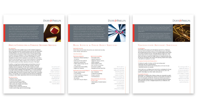Duff & Phelps is the premier global valuation and corporate finance advisor with expertise in complex valuation, dispute and legal management consulting, M&A, restructuring, and compliance and regulatory consulting. Cullinane was challenged with writing and designing their global capabilities brochure to convey their combination of technical analysis and industry expertise that enhances value, helps their clients build businesses and gives them peace of mind when making important decisions.
