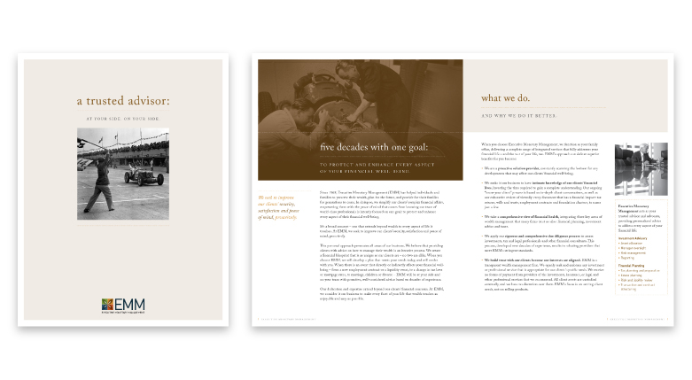 Since 1968, Executive Monetary Management (EMM) has helped individuals and families to preserve their wealth, plan for the future, and provide for their families for generations to come. In doing so, they simplify their clients’ complex financial affairs, empowering them with the peace of mind that comes from knowing their team of world-class professionals is intently focused on one goal: to protect and enhance every aspect of their financial well-being. It’s a broad concept – one that extends beyond wealth. As successful as their business became, their identity lacked life and didn't adequately reflect what they were able to offer their clients. They approached Cullinane to refresh and update their identity to more closely align with their unique offering.
