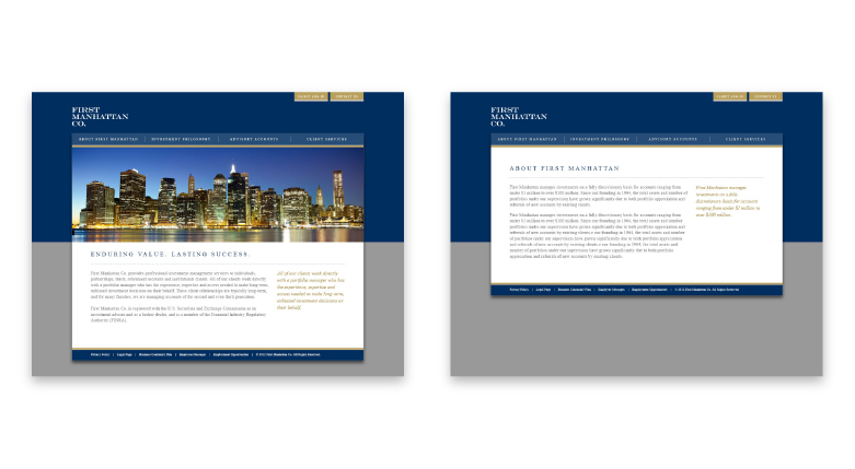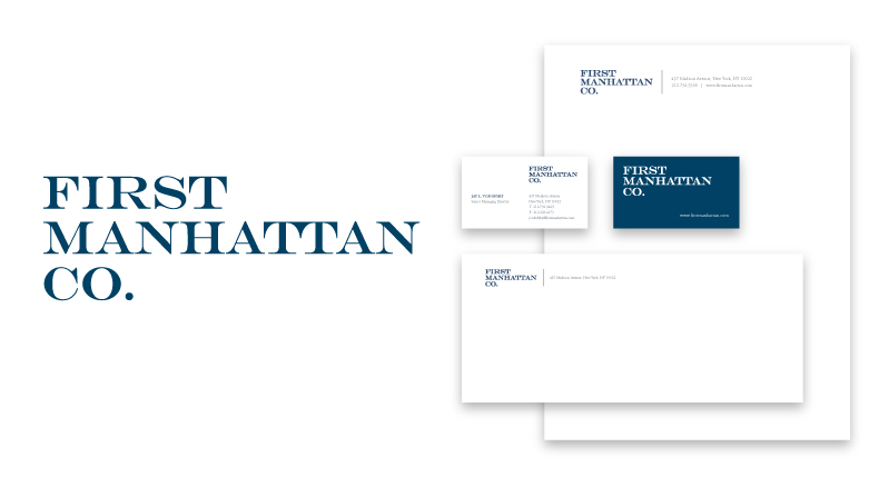 Cullinane first initiated a messaging and brand positioning exercise in order to define more accurately -- and honestly, what First Manhattan represented. Building on the contents of that document, Cullinane created a targeted brand identity presentation consisting of several concepts which embodied the new positioning. Once chosen, a stationery system, PowerPoint template, capabilities brochure and website followed.