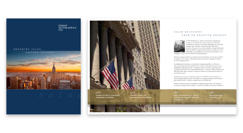 First Manhattan Co. provides investment management services to individuals, partnerships, trusts, retirement accounts and institutional clients. Their clients interface directly with a portfolio manager who has the expertise and experience needed to make appropriate unbiased investment decisions on their behalf. Their client relationships are typically long-term. For many clients, they are managing accounts of the second and third generation. Cullinane was tasked with bringing a fresh new look and feel to their messaging and positioning, brand identity, website and marketing collateral.