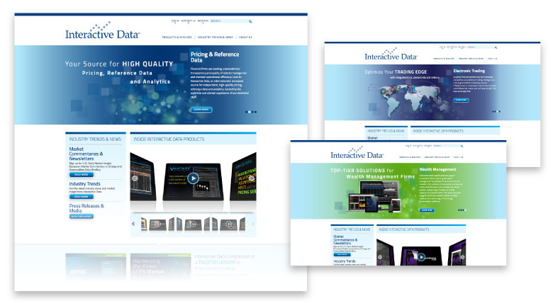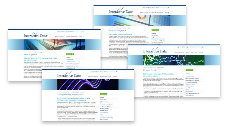 Interactive Data Corporation is a Trusted Leader in financial information. Thousands of financial institutions and active traders, as well as hundreds of software and service providers, subscribe to our fixed income evaluations, reference data, real-time market data, trading infrastructure services, fixed income analytics, desktop solutions and webbased solutions. Interactive Data supports clients around the world with mission-critical functions, including portfolio valuation, regulatory compliance, risk management, electronic trading and wealth management. Interactive Data Corporation asked Cullinane to create a simplified, sophisticated and engaging digital experience for their global website.