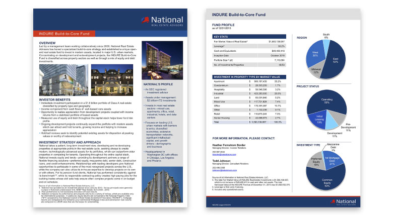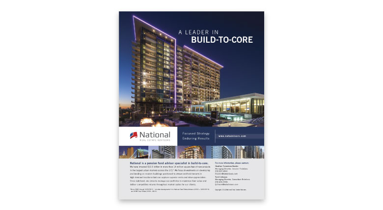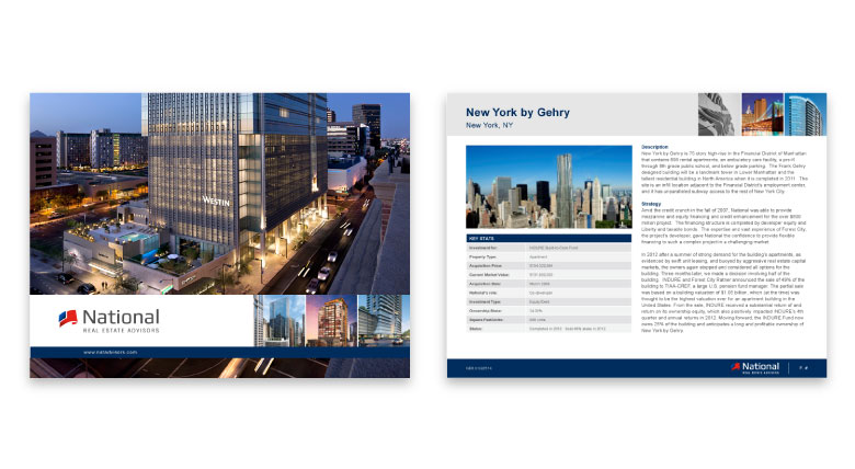 Headquartered in Washington, DC with Assets under management of $2 billion covering over 70 investments, National Real Estate Advisors specializes in executing build-to-core strategies, including an openend fund. They invest in all major real estate sectors—mixed-use, apartments, office, retail, industrial, hotels, and data centers. They primarily focus on investments in leading U.S. urban markets. Since their existing identity did not reflect the breadth of their offering and upscale portfolio of investment properties, they asked Cullinane to develop a new brand identity platform, graphic standards, PowerPoint templates, stationery system, advertising and website.