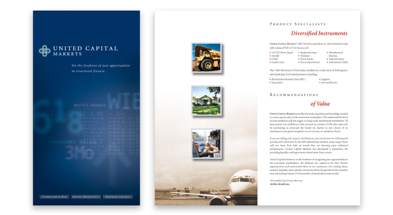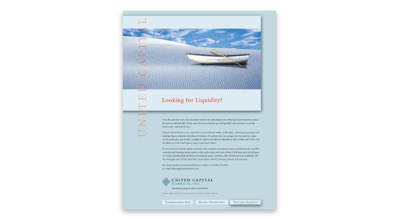 Although small in size, United Capital Markets Inc. (UCM) had a formidable presence as a secondary market maker specializing in trading and sales of structured finance products. They found opportunities for investors, and provided the marketplace with liquidity. They tapped Cullinane to develop an overarching ad campaign for Institutional Investors Newsletters.